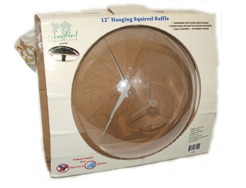 Size:12' Hanging Baffle Unbreakable dome resists squirrel damage. Protects feeder and seed from squirrels and weather. Easy to assemble.Includes:(1) 1-3/4' Thread loop(1) 1-1/8' x 8 ' #8 Open eye bolt(1) #8 Lock nut(1) Clear polymer dome Assembly Instructions:Tighten the #8 lock nut at the end of the threads on the #8 eye boltHold the loop at the top of the dome and screw the #8 eye bolt through the dome into the loopTo hook the feeder to the dome, hold feeder at an angle to slip eye bolt of feeder over eye bolt of dome